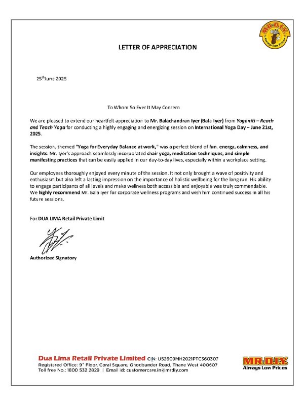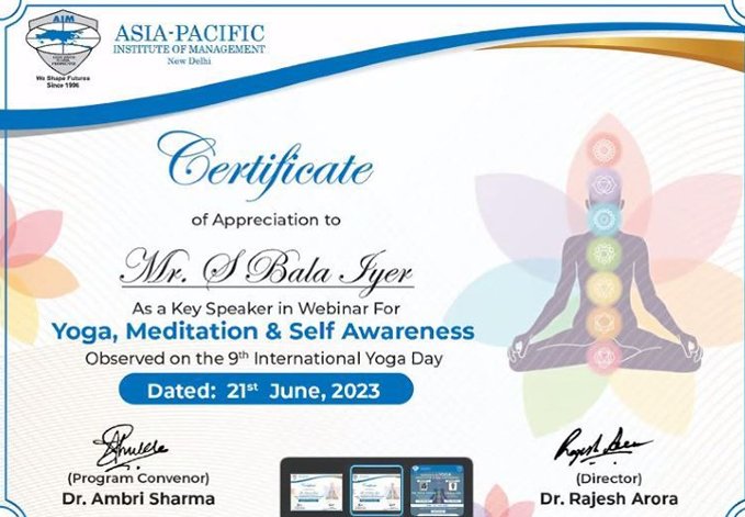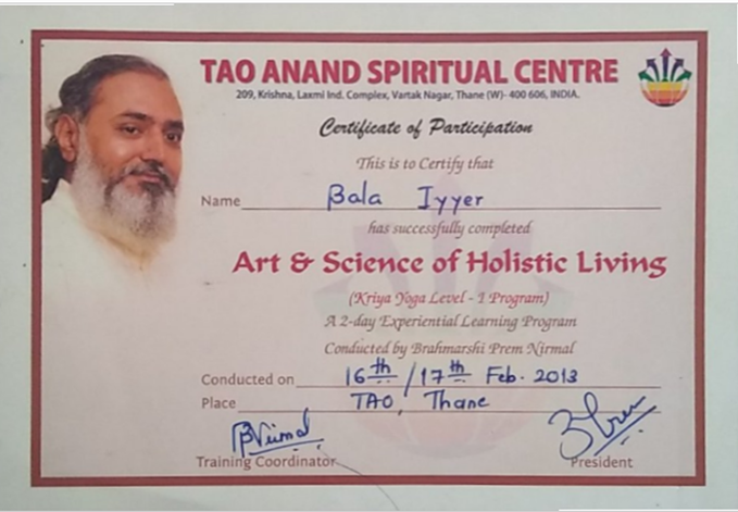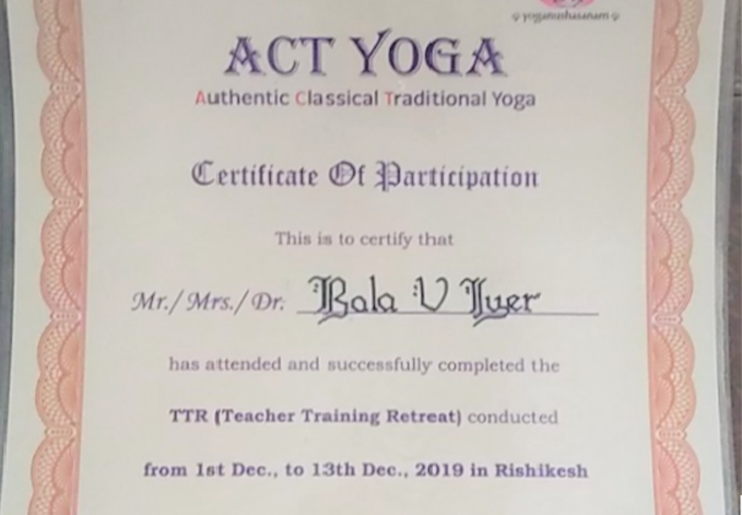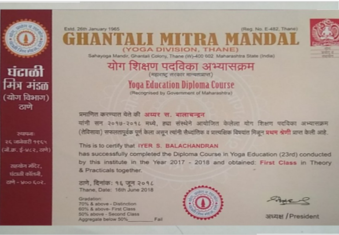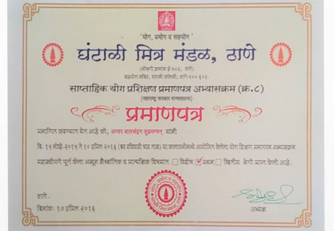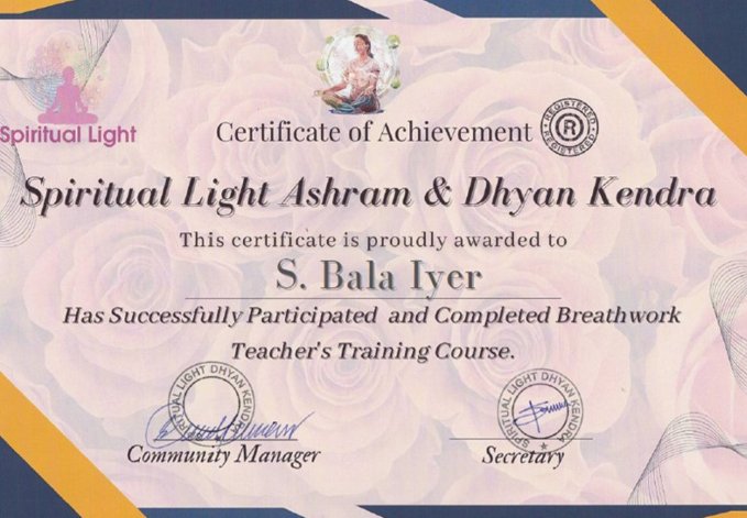 Completed ONE MONTH course in Pranayama, Mudra and Bandha )